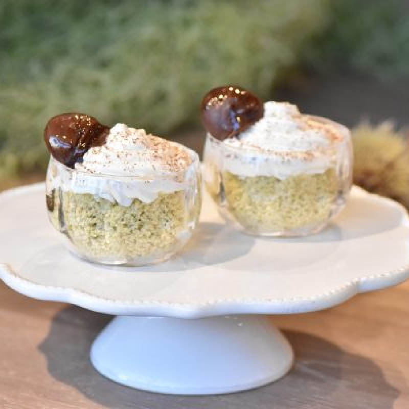 マロンムース、熊本県産利平栗のペーストに2種のチョコ生地(ガトーショコラ・チョコスポンジ)を合わせたミニパフェ。