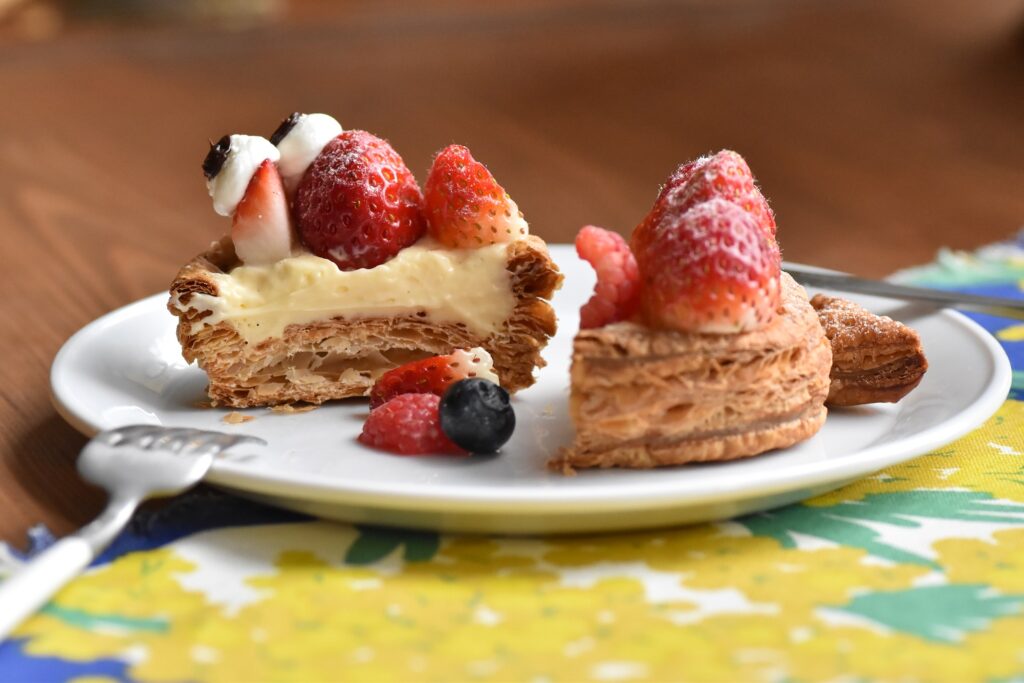 魚の形をしたサクサクパイに、カスタード、いちごをトッピング。